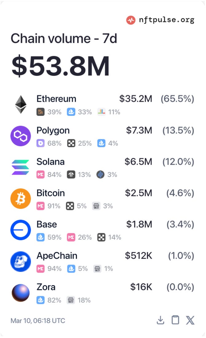 Ethereum claimed the top spot with a 65.5% market share while with $35.2M chain volume. Polygon and Solana are ranked 2nd and 3rd, with $7.3M and $6.5M chain volume respectively.